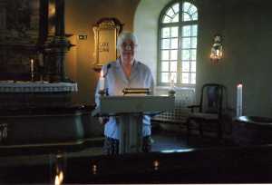 På den tiden när fotot på mig är taget under en andakt i min hembygds kyrka, så visste jag inget om frikyrkotanters ljublå blusar. Men Jonas Gardell hade lagt märke till oss. Som väl är så har jag en syster, som berättar för mig hur viktigt det är att en talare är rätt klädd. Så hon bjöd mig på en kavaj varje sommar att ha över blusen. Allt för att åhörarna skulle lyssna bättre. På så sätt har jag fått tre olika kavajer av henne. Tre olika somrar. Nu är Missionskyrkan i Varola såld. Där kan jag inte få predika längre. Där är den ena delen av min frikyrkohistoria med första nattvarden utanför Svenska kyrkans lokaler. (Se brefvet.com och bilden från den oinredda andra våningen).
