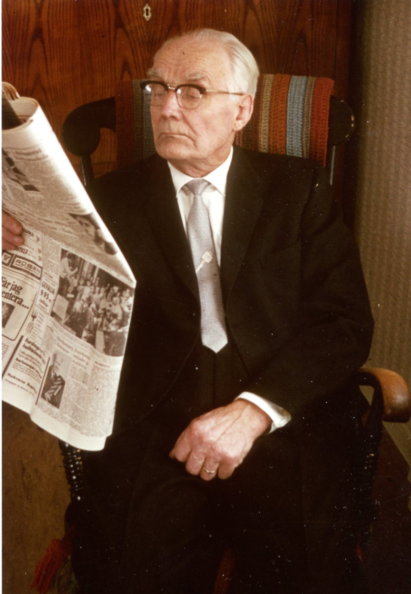Bilden är på min äldste farbror Jonatan, när han var finklädd på kalas. Hans kära livskamrat i allt arbete från början på gården fyllde 90 år. Min kusin Per har väl tagit fotot, när allt lugnat ner sig och släkt och vänner farit till sitt. Jonatan var född den 2 april 1885 och bland syskonen hade han placering 3/8. Detta skriver jag med minnet av min psykiatriska journal från september år 1956. Där jag har placering 6/6 i syskonskaran. Egentligen är jag 7/7 för en broder till mig dog vid födelsen med placering 2/7. Nu är jag redan framme vid poängen. Farbror Jonatan hade bil och körkort först av alla. Systrarna tog aldrig något. Inte min pappa David heller. Där fattades det pengar och möjlighet att övningsköra i Trollhättan. Farbror Jonatan lärde mig köra bil på åkern. Det var en nödvändig kunskap för att kunna arbeta ”och få nåt gjort”.