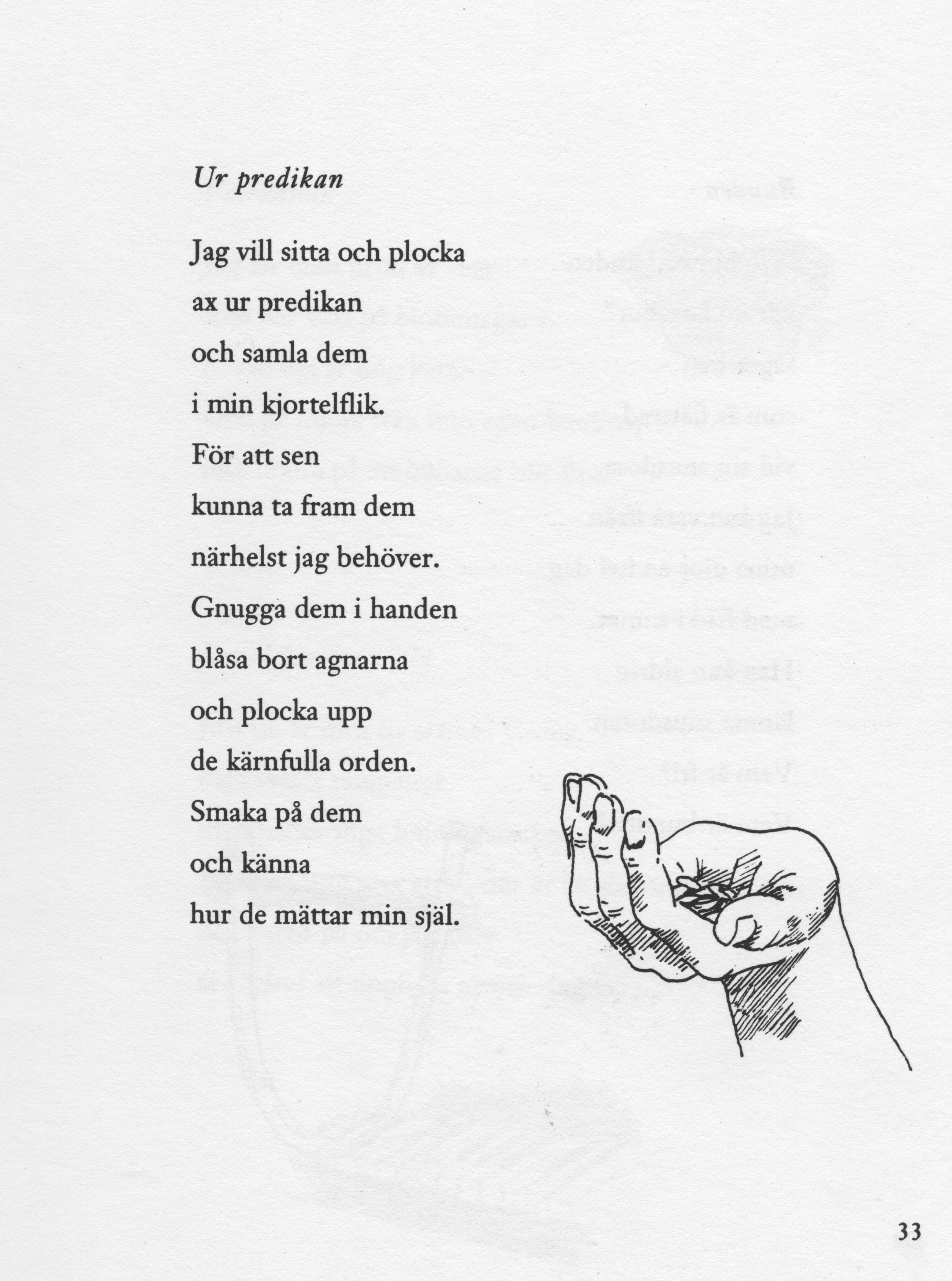 Dikt av Karin Breman ur samlingen: ”Den som planterar ett träd har inte levt förgäves” Illustration Cristina Jonsson 1995
