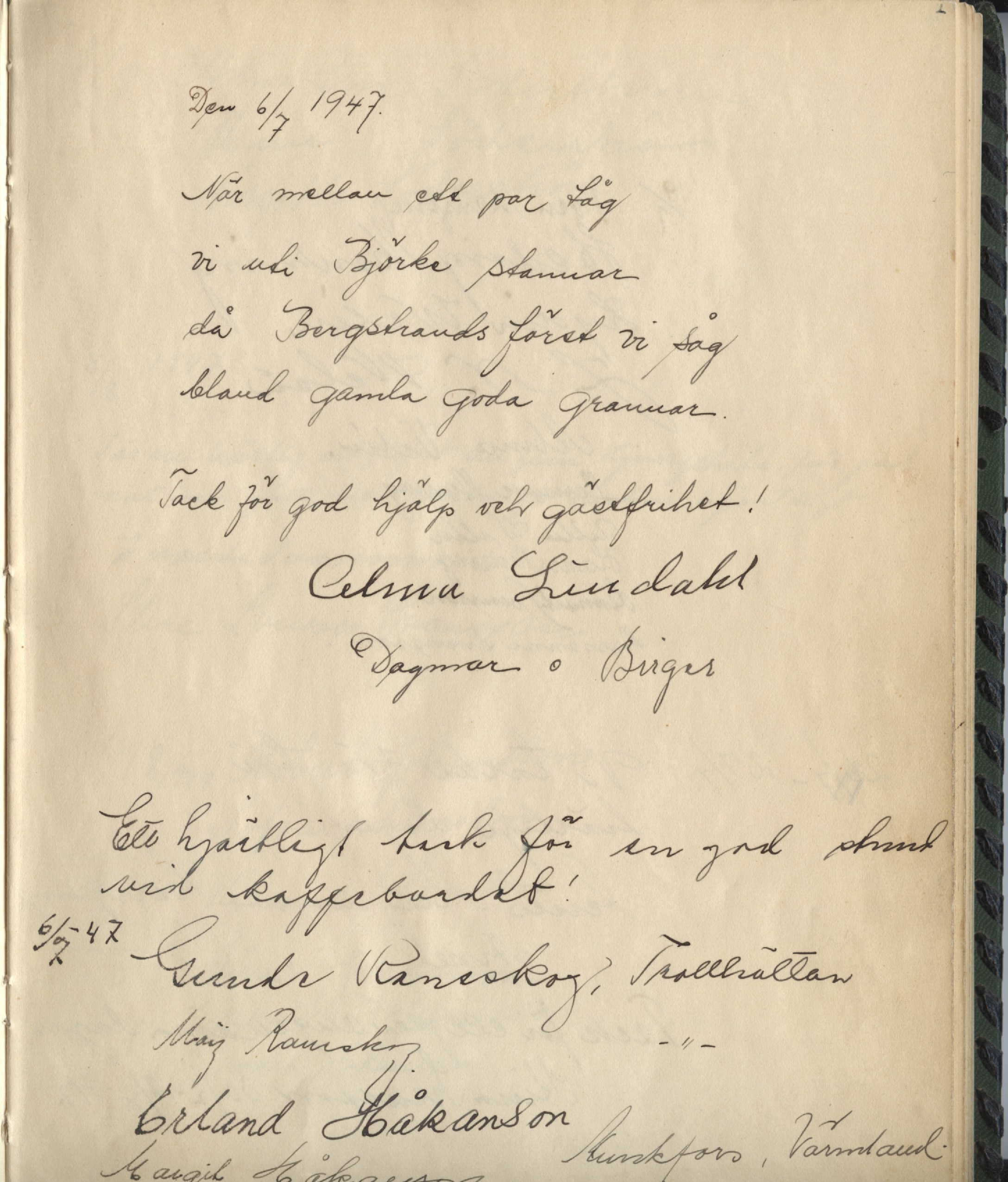 Första sidan i hemmets Gästbok har Gunde Raneskog och hans fru Maj längst ner. Raneskog var pastor i Trollhättans Missionförsamling och den lilla församlingen i Norra Björje var en utpost. Senare blev han distriktsföreståndare och tog emot mig som elev år 1954 till ”Bibel och Evangelistkurs” under en månad och även en ny kurs år 1959 efter mitt livs stora trauma år 1956. Det är en mycket viktig bibellärare i mitt liv samtidigt med distriktsföreståndare Nils Engmyr. En detaljerad undervisning om Tabernaklet i öknen fick jag först av missionär Wilhelm Bergling i slutet av 60-talet.