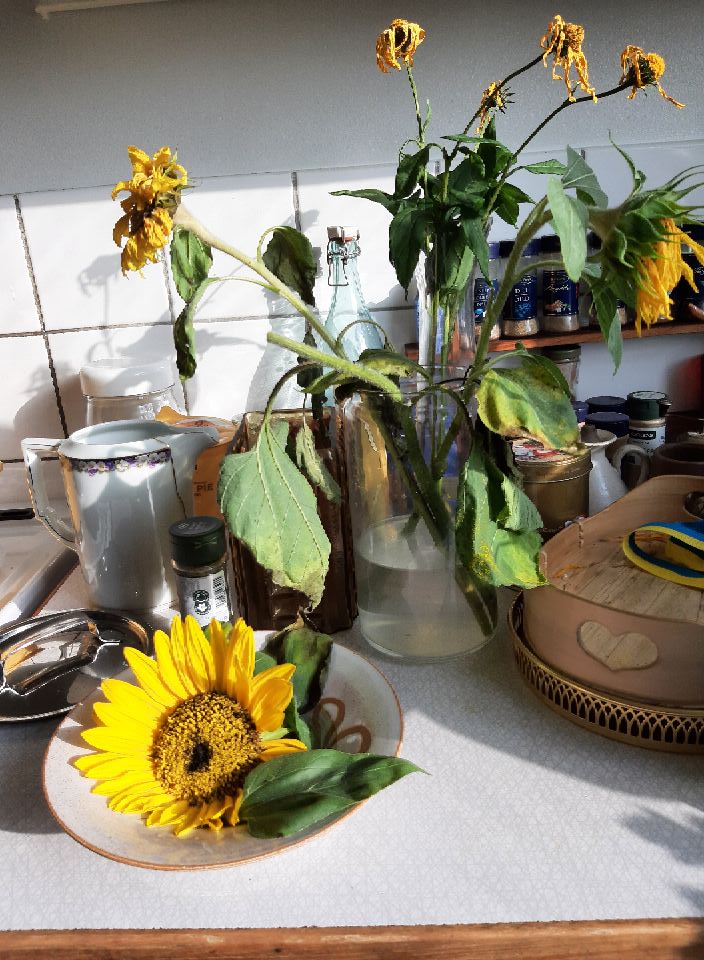 Första buketten var en kusin till Solrosen nämligen Jordärtskockor. En av tre solrosor räddade jag från att vissna och gav den vatten genom kort stjälk.