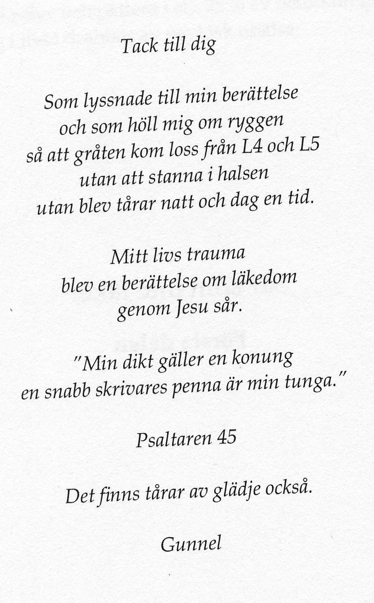 Martin Olsson, who filmed a thaw without words, has given me the permission to share this experience. Many, many years ago we got a message during the Hönö Conference, that someone in the assembly was bitter. Afterwards I revealed it was me, and I also said why. There was no thaw that time, but a man told me privately that he’d had a vision. He had seen my cross inside the ice. The Bible says that each one of us has his own cross to bear. But he had seen my cross inside the ice.